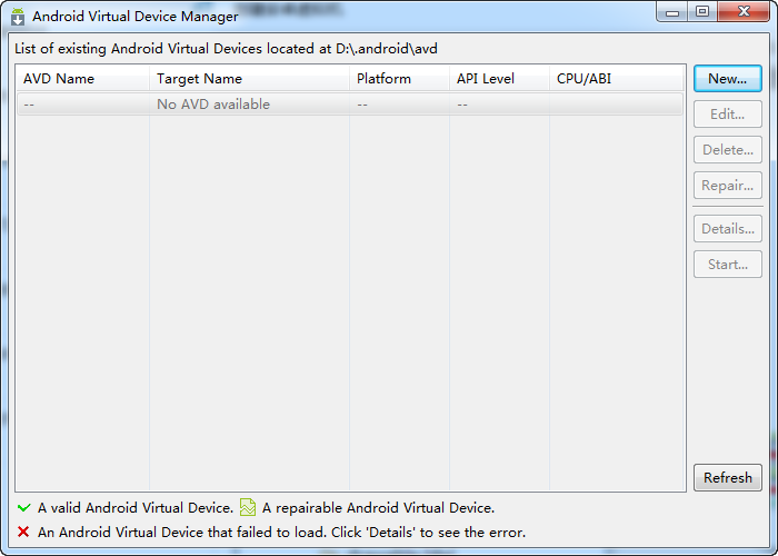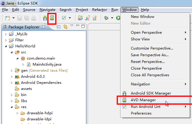 安装好Eclipse+ADT,并设置好Android SDK路径后,点击图中按钮,或选择菜单中相应的选项,打开AVD Manager(安卓虚拟设备管理器)。