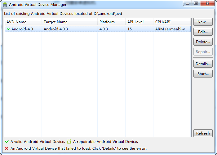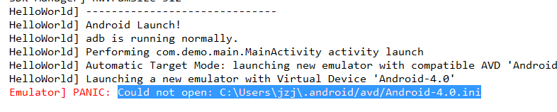 在安卓SDK的分区根目录如果能找到一个.android的文件夹,里面有错误提示中说的/avd/Android-4.0.ini文件。将这个文件夹直接复制到错误提示中所说的C:\Users\jzj\目录中即可。