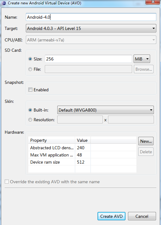 填写名称、内存卡大小,选择屏幕尺寸,点击Create AVD。