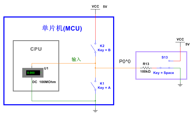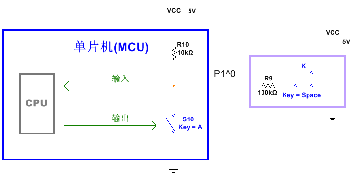 让这个装置输出低电平,然后连接51单片机的P1.0口。这时,VCC经过10kΩ上拉电阻到达IO口,再到装置内部的100kΩ电阻,通过开关K接到GND。根据分压原理,P1.0上的电压值大概是4.55V,于是单片机读取的是高电平。而事实是,装置想输出低电平告知51单片机。这里单片机管脚作为输入功能,却干扰了外界装置的输出值,相当于单片机的这个IO口也在输出。