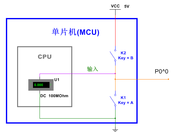 现在试想,如果我不小心用手碰到了P0.0端口,而由于人体本身就是阻值很大的导体,周围有很多电磁波干扰,手上可能存在一些很微弱的电流,这个时候,电压表的读数就会发生变化,单片机读取的电平高低就会变。高阻态表现出来的结果就是外界很小的干扰,都可能导致读取的电平变化,甚至即使没有碰这个IO口,它每次读取的结果也可能不一样,因为外界的电磁波等可能会干扰到IO口。稍后我们会利用51单片机做个实验,来体验P0口的高阻态。