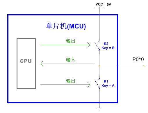 当P0第二功能作为输出时,K1和K2两个开关轮流打开。K2闭合K1打开,就会输出高电平,并且其驱动能力很大,因为电子开关的阻值小(不像上拉电阻的值那么大)。反之K2打开,K1闭合,就会输出低电平。