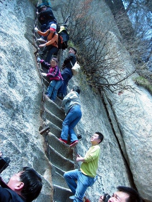 在特别陡的地方,例如华山有的地方坡度都要到90度了,应该扶着东西倒着下山,或者坐在台阶上慢慢下来。