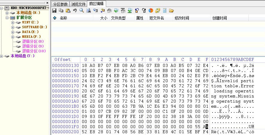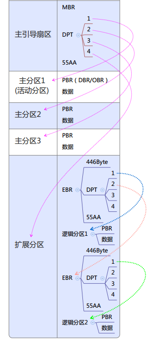主/扩展分区的分区表,保存在硬盘的主引导扇区的DPT中;而逻辑分区的分区信息是链式的。