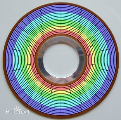 在前面的示意图中,每个磁道包含的扇区数相同,因此外圈的扇区弧长远比内圈大,好处是硬盘的控制技术实现容易,坏处是没有充分利用存储空间。于是就有了ZBR技术,将硬盘从内到外分成多个区,同一个区每个磁道有相同数目的扇区,但靠外的区包含的扇区要比靠内的区多。示意图如下。