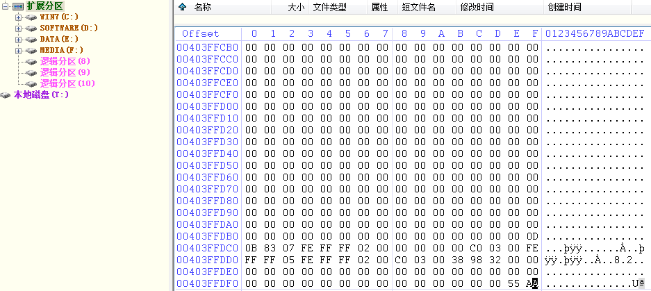 下图是我的硬盘中的第一个EBR,可以看出前面446字节对应主引导扇区中MBR的区域均为空,而后面64字节的分区表只用了前两项,结束符为0x55AA。