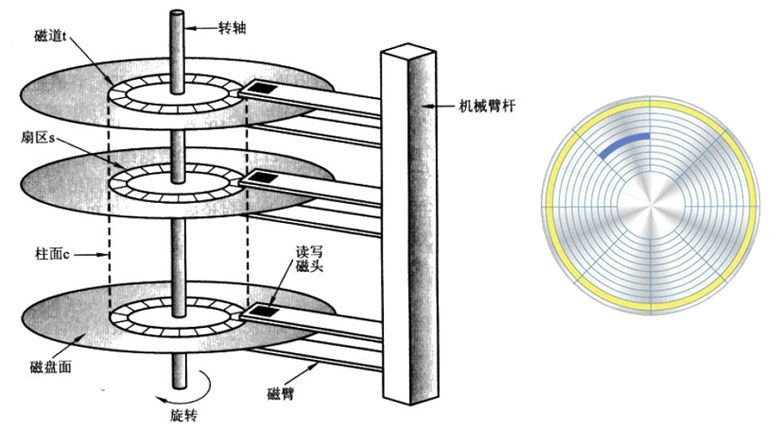 - 多个盘片重叠起来,直径相同的一组磁道组成圆柱形,称为柱面(Cylinder)