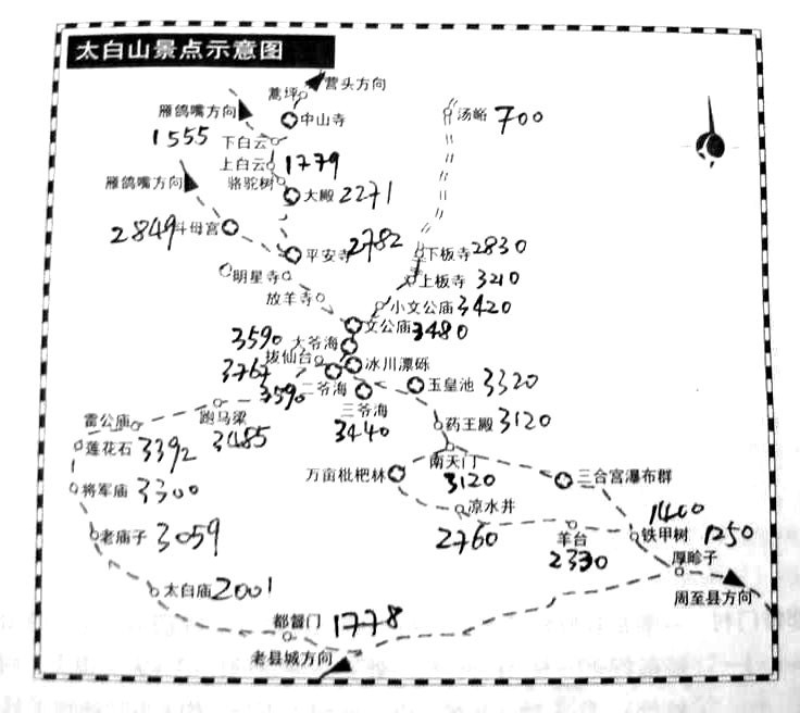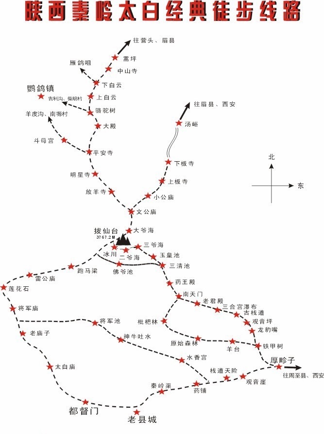 从山下到太白山顶峰(图中的拔仙台,海拔3767.2m)的几条路线如图。