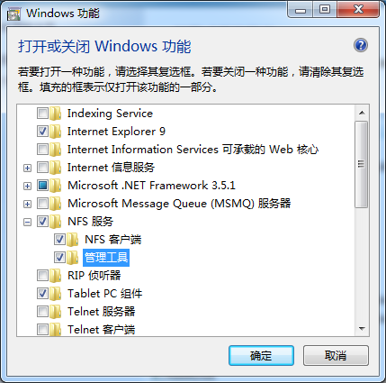 1、首先启用NFS功能(控制面板->卸载或更改程序->打开或关闭Windows功能):