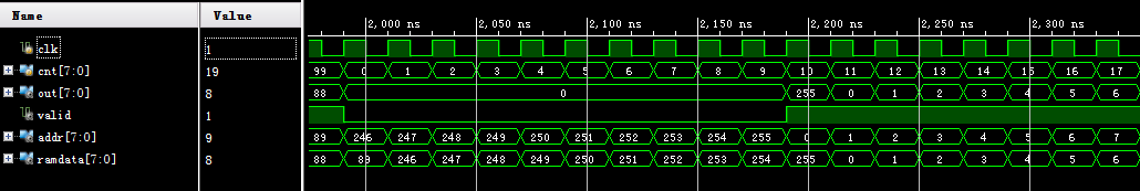 修改正确后的仿真波形如下图,可以看出valid信号和RAM信号相对于cnt,都滞后了一个周期。从而实现了问题中给出的要求。