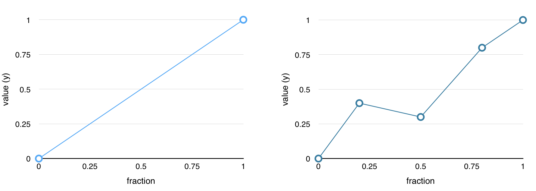 - 使用KeyFrame后,每两个关键帧之间成为一段动画,期间Value值线性变化。右图中每个点表示一个KeyFrame。