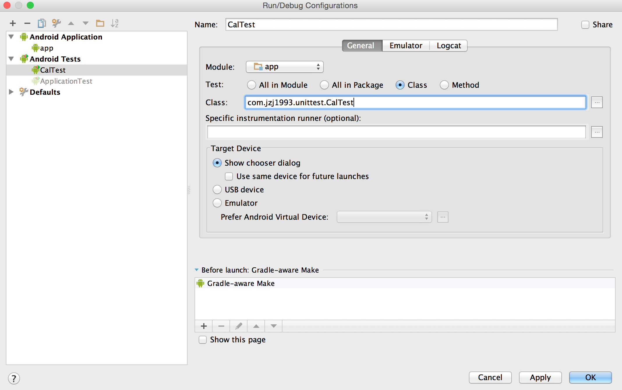 这里我们设置Test Artifact为Android Instrumentation Test,进行JUnit Test,测试代码会通过Android Test Runner在Android设备上运行。