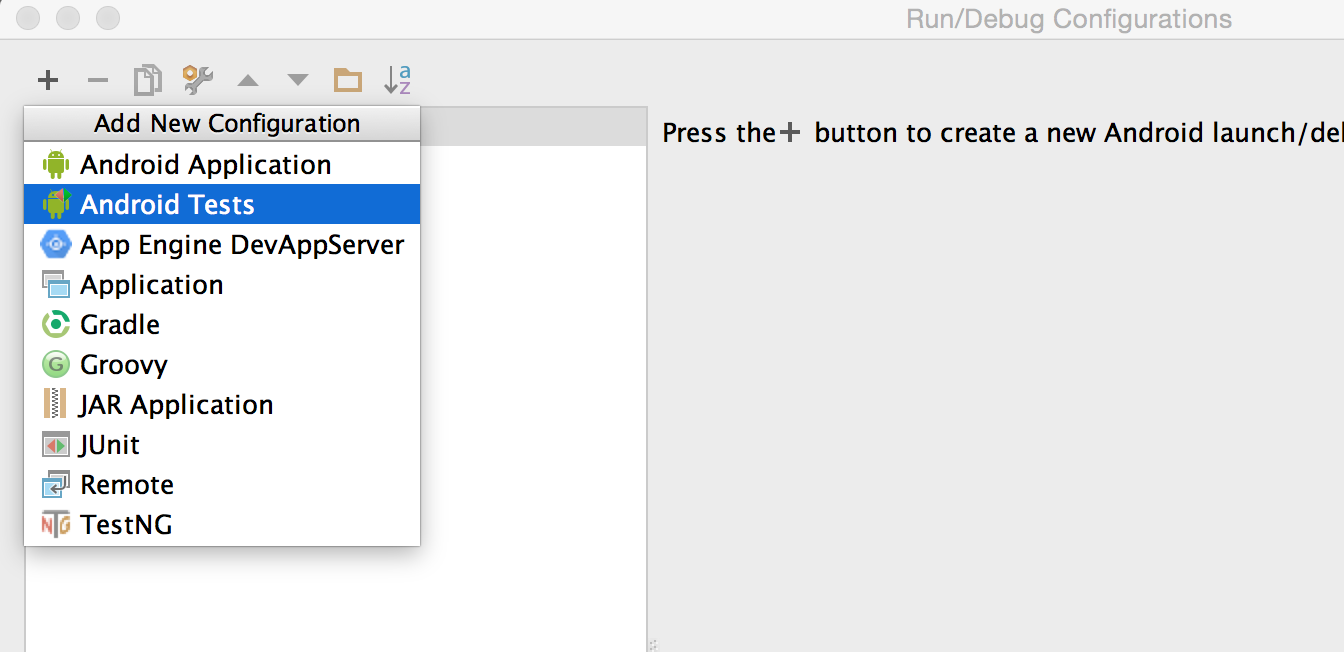 点击左上角的加号,选择Android Tests