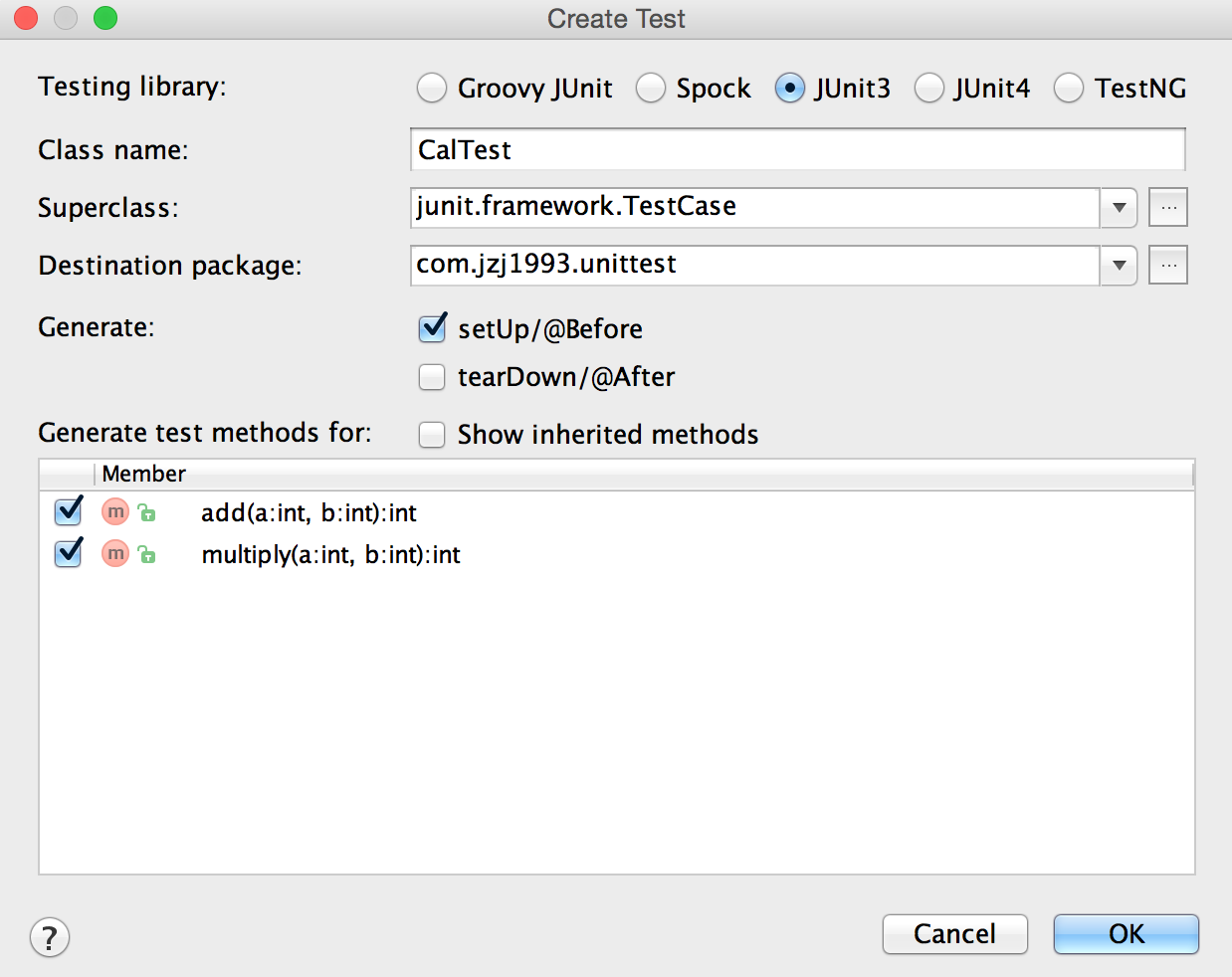 勾选setUp/@Before和要测试的方法,点击OK。setUp用于进行初始化操作,tearDown则可以进行清理、释放资源等操作。