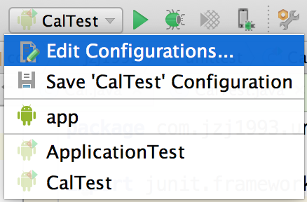 第一次运行测试类时,需要配置Run Configuration。最简单的方法是直接右击测试类,Run,弹出三个不同图标的选项,分别表示正常的App、AndroidTest和JUnitTest。因为Test Artifact选的是Android Instrumentation Test,因此这里选AndroidTest。