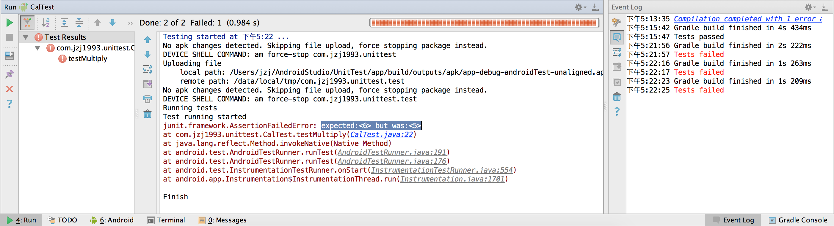 运行的结果如下。Run窗口中提示Done:2 of 2 Failed:1,并且Exception信息中指出expected:<6> but was:<5>,EventLog窗口提示测试失败。