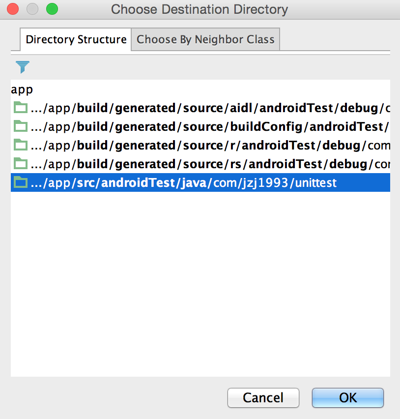 如果弹窗要求选择目标文件夹,选择src/androidTest/java目录下同名的包(如果没有这个文件夹,需要提前手动创建)。