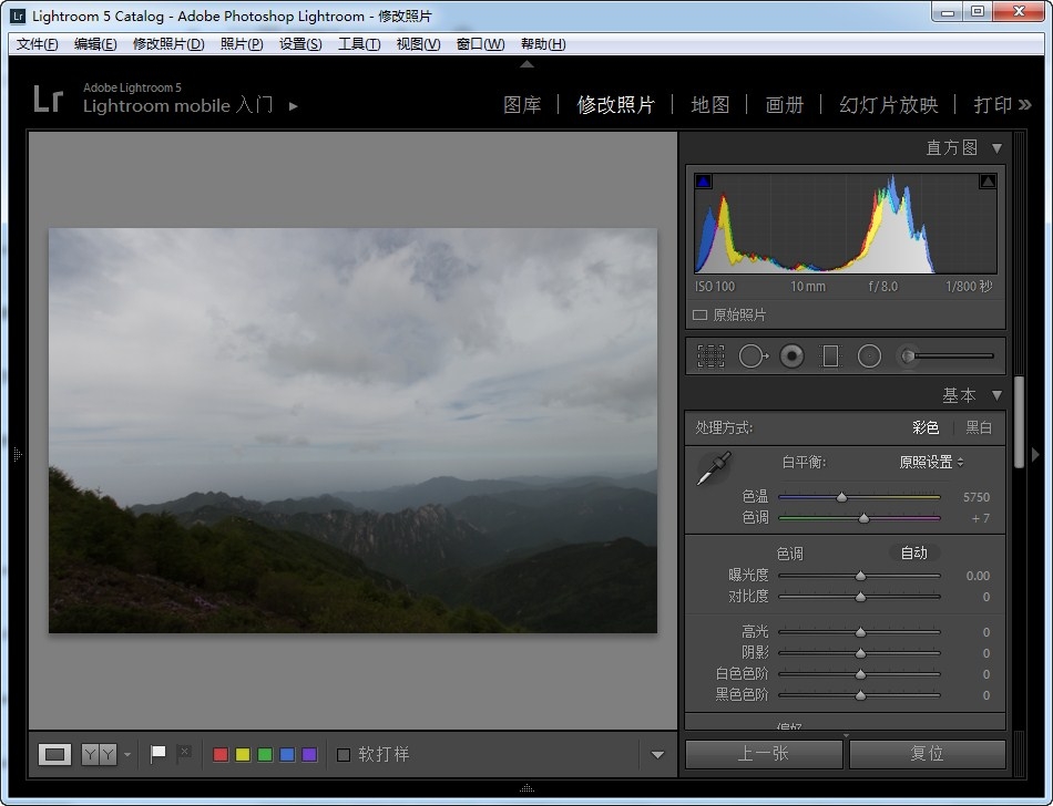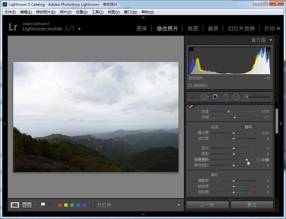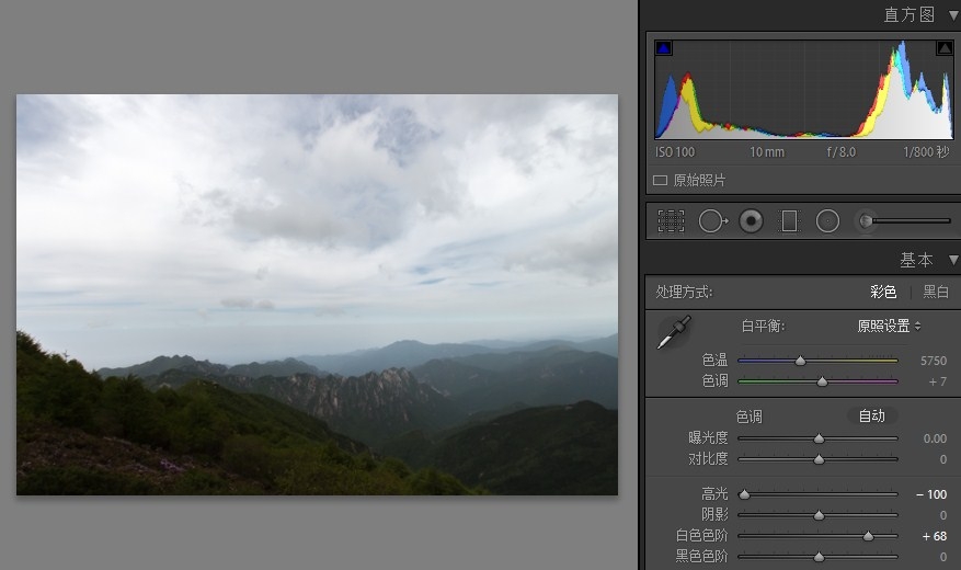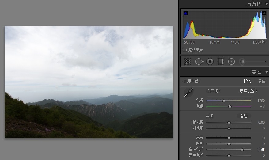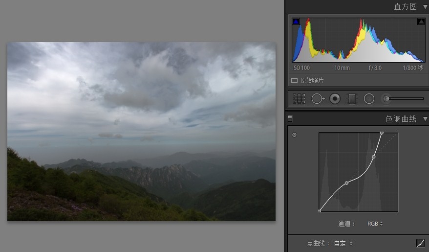 直方图能很直观的反应照片中的信息分布。直方图的横坐标是亮度,纵坐标是这个亮度下的像素数量。LR中的直方图分RGB三种颜色分量。可以看出照片的直方图有两个峰,左边的峰对应照片中较暗的群山,右边的峰对应照片中较亮的天空。