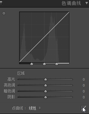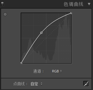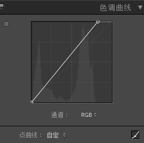 LR中还可以通过调整“色调曲线”实现白色色阶的调整。色调曲线横坐标是原来的直方图的亮度值,纵坐标是调整后的亮度值,曲线为两者的对应关系。调整白色色阶的方法如下。