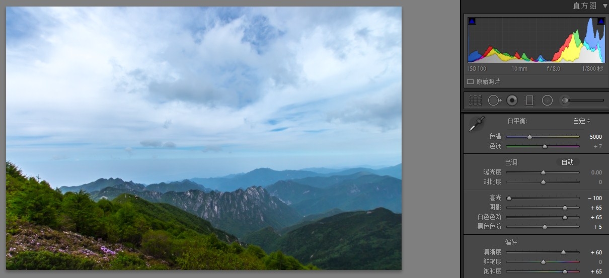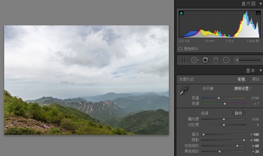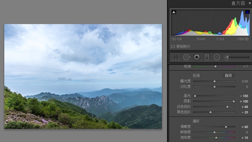 将对比度滑块往右拖动,直方图会向两侧扩展,整个画面中亮的部分更亮,暗的部分更暗。对比度调整适合雾霾或云雾比较多的照片,能使得画面更加清晰。