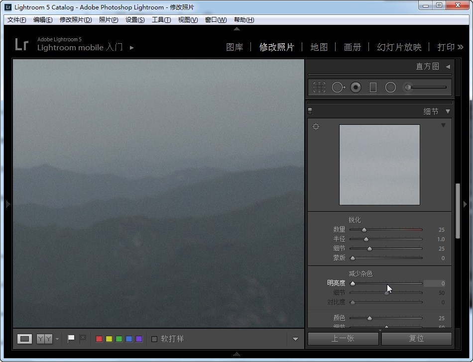 由于光线弱、曝光时间长、光圈小等原因,照片中经常会出现噪点。如下图,单击照片区域就会默认切换到1:1显示,可以看出天上有很多不光滑的小点,这个就是噪点。在LR中找到“细节”,往右拖动“减少杂色”下的“明亮度”滑块,即可减少甚至消除噪点。