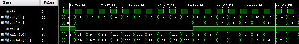 修改正确后的仿真波形如下图,可以看出valid信号和RAM信号相对于cnt,都滞后了一个周期。从而实现了问题中给出的要求。