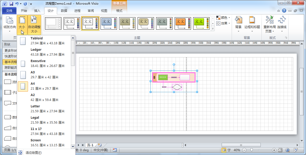在设计菜单中,还可以设置页面的尺寸和方向,例如A4纸横向画面。默认情况下,自动调整大小的选项是开启的,如果绘制的图形超出了一张纸张的面积,会自动进行扩展。