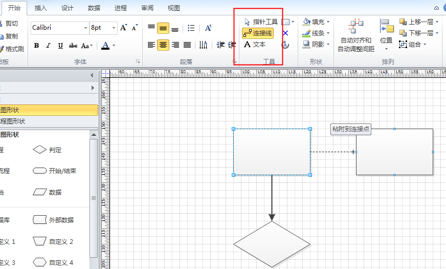 在菜单-开始中选择连接线工具,然后在形状之间拖动,即可绘制形状之间的箭头。绘制完成后,可重新切换回指针工具。