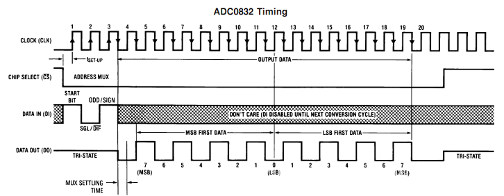 当参考电压为5V时,如果把输入电压从0一直调到5V,读取的数据应该是从0到255,2.5V时应该是128。但是我发现一些源码在输入0~2.5V时读取出来的是0~255,到2.5V时读取的数据为0,从2.5到5V,读出的值又从0增加到255,始终不正确。今天下午特地查阅的ADC0832英文原版的DataSheet,又参考了一篇中文文档,终于写出了其完整的程序,并且先后读取了MSB FIRST DATA和LSB FIRST DATA,进行比较,如果两个数据相等,返回读取的数据,否则返回0,这样可以避免读取发生错误,更稳定可靠。并通过了Proteus仿真。