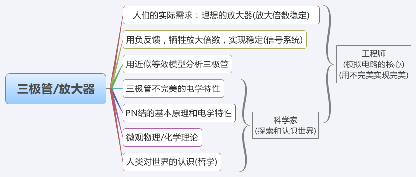 协调这两方面的冲突,解决这种难题,就是工程师的任务了;模拟电路的核心正是工程思想。工程师不关注三极管怎么被发明的,只关注三极管有什么特性,关注人们实际生活中需要什么样的电路。然后设法用不完美的器件,制造出尽可能满足人们需要的设备。利用不完美的东西去创造完美,工程很多时候就是在做这件事。