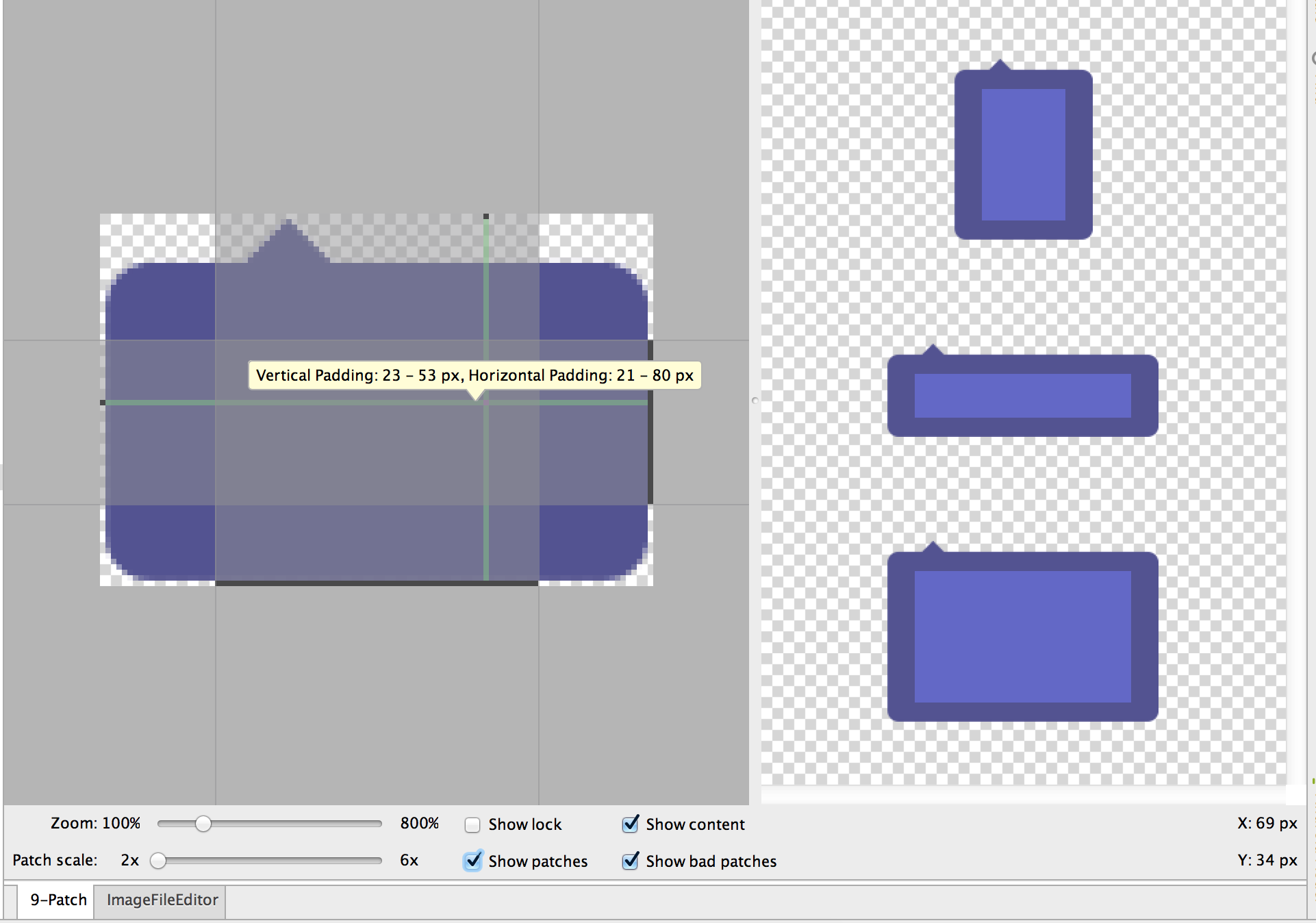 Android中的9-Patch(.9图)总结 发表于 2016-11-25 分类于 开发技术 阅读次数: Valine: 本文字数: 234 阅读时长 ≈ 1 分钟 安卓中的9Patch图片的扩展名为“.9.png”;在PNG图片基础上,四个边各增加了1像素的边框区域,用于控制图片的拉伸。 左边、上边的黑色点(或线),控制拉伸区域; 右边、下边的黑色点(或线),控制内容展示区域。 默认的Padding就是内容区域和整个图片之间的距离,也可以设置View的Padding属性覆盖默认值。 如下图,在Android Studio的9-Patch图预览中,可以直接看到不同拉伸情况下的Content区域,还可以直接鼠标拖动调整拉伸和内容展示区域。 相关文章 NinePatch图(9-Patch图,.9图)使用全面介绍 Android Lint:自定义Lint调试与开发 Android Lint:基本使用与配置 Gradle开发快速入门——DSL语法原理与常用API介绍 Android Gradle配置快速入门 Android Bitmap操作内存问题总结(图片处理、截屏等) Glide使用简介与源码分析 Android 7.0中RatingBar评星点击区域不准确的解决