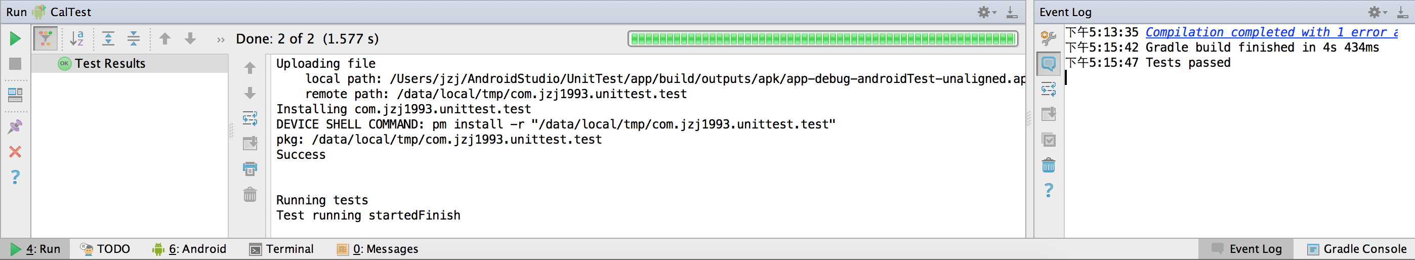 同时测试代码会被执行。因为这里的Cal编写正确,testCase能通过测试,所以下方的Run和EventLog窗口会提示测试完成和测试通过的信息。这个过程中,可能会弹出选择Android设备的窗口,同时可以看到Run窗口中有Uploading file、Installing等信息,说明测试代码确实被编译成了APK文件(Test Runner),在Android设备上运行的。