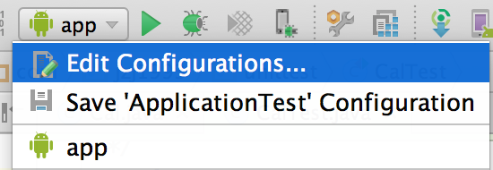 第一次运行测试类时,需要配置Run Configuration。最简单的方法是直接右击测试类,Run,弹出三个不同图标的选项,分别表示正常的App、AndroidTest和JUnitTest。因为Test Artifact选的是Android Instrumentation Test,因此这里选AndroidTest。