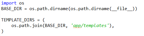 在settings.py中添加设置项TEMPLATE_DIRS,即模板文件夹,如图。其中BASE_DIR为工程目录,魔术变量__file__对应了settings.py自身的完整路径,os.path.dirname方法返回其所在的文件夹,执行了两次,得到BASE_DIR,刚好是工程目录。而模板文件夹在BASE_DIR/app/templates中,我们用os.path.join方法连接文件夹路径,即可得到。