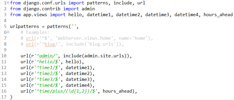 在WebServer/urls.py中的urlpatterns中添加如下代码,利用正则表达式设置URL路由。
