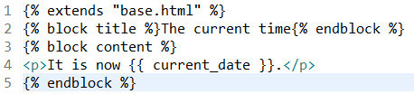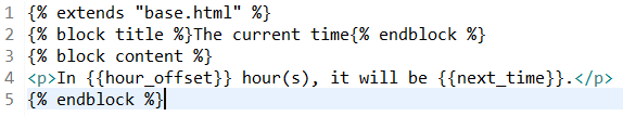 再写两个子模板文件datetime.html和hours_ahead.html,均继承自父模板文件base.html,内容分别如下。