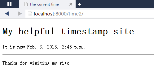 hours_ahead方法则从url接收一个参数offset,并根据这个参数响应请求。int方法将offset从字符串转换为整型值,如果转换失败会抛出异常,则响应404页面。关于url参数的传入,将在下一步设置url路由的代码中看到。