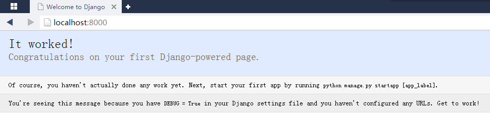打开浏览器,输入http://localhost:8000,即可打开默认的Django页面如下。注意不要忘了输入端口号8000,否则是访问不了的(如果设置成HTTP默认的80端口,则网址可以不输入端口号)。