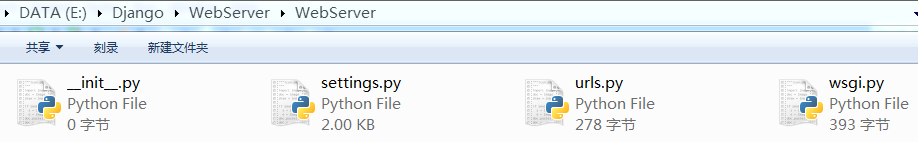 在Windows下,启动cmd并切换到Workspace目录,执行django-admin.py startproject WebServer,就会生成一个WebServer子目录,如图。这个E:\Django\WebServer目录就是我们将要使用的工程目录。注意,这里直接执行了py文件,因为py文件打开方式已经默认关联了Python,如果没有关联,可以执行python ***.py,后面不再重复。