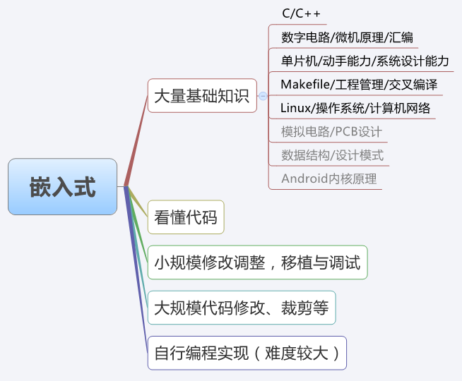 总得来说,嵌入式涉及的东西特别多,软件、硬件都有,其中很多东西对理论要求倒也不高,但是不好理解。知识太多需要长期坚持和积累。初级的嵌入式工程师,主要是移植驱动和系统之类,看懂已有的程序,做一些小的调整;而高级的嵌入式工程师,则能对代码进行大规模的调整,甚至自己写代码。这一点非常不容易,因为嵌入式的程序往往很难写,每一行代码都可能包含了大量的背景知识(所以待遇肯定也不会差)。