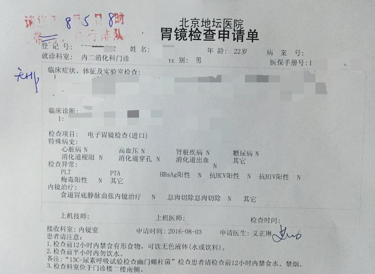 我是在北京地坛医院做的胃镜(局部麻醉的普通胃镜)。之所以选了这个医院,主要是因为离住的地方近,很容易晕车的我可以直接步行过去,也不用起太早跑去医院;同时也是比较有名的三甲医院,感觉不会太差。