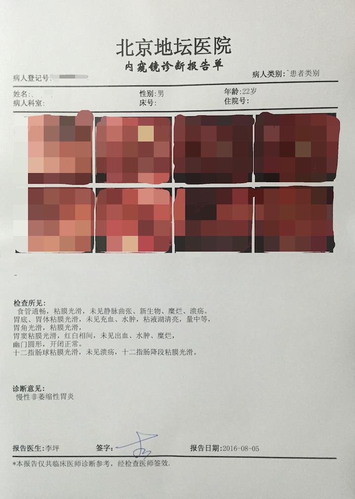 没多久结果也出来了,报告单上配了几张彩图,然后写的是慢性非萎缩性胃炎。看到这个我也放心了,毕竟胃炎也不算太严重的问题。喝麻药的时候看时间是8:34,到这个时候才8点四十多。