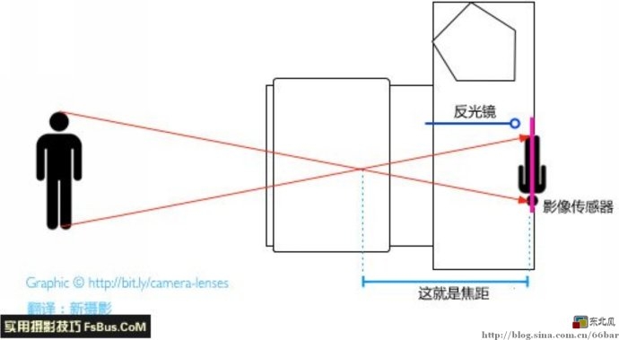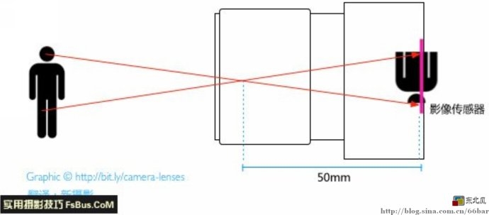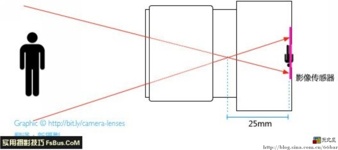 让我们回到主题上。从图中你能看到,成像光线会在镜头内相交于一点。在光学上,这个焦点称作“节点”(译注:在同介质中,主点与节点重合)。从节点到影像传感器的距离称作“焦距”(译注:实际上焦距是主(节)点到焦点距离,从主(节)点到成像元件的距离等于焦距加调焦距离,特定条件下可近似简化为焦距):