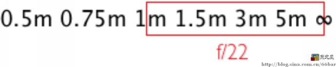 这些数字用来显示在一个特定光圈下的景深与对焦距离之间的关系。当你将光圈设在f/22,并对焦在无限远,你可能会发现在3米之后的景物都是清晰的。