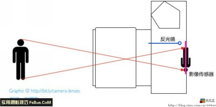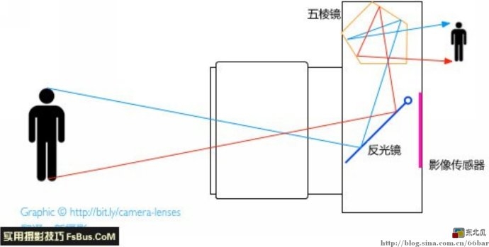另一方面,因为影像会颠倒,所以单反相机中需要用五棱镜(位于相机顶部)将影像再次颠倒回来: