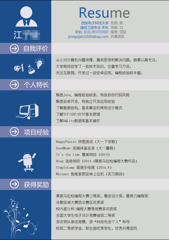 我在三月份的时候就在开始做简历。简历也完全是自己想着做,参考了网上一些文章。由于了解一点平面设计知识,之前也做过不少PPT之类,我打算把自己的简历做得个性化一点。对于我而言,其实虽然技术上学了不少东西,是别人眼里的大神,但是只有我自己清楚,我学的很多东西并不深入,比较散。说的直白点,差不多是什么都知道一点,但是相当于什么都不会。因为之前学技术根本就没怎么考虑过工作的事,完全是凭着爱好、凭着参加竞赛、做项目的需求去学习的,而且很不幸竞赛也没拿到满意的奖项(没拿到过国家奖)。综合实力是有一些,但是要说找工作,做硬件硬件做不了,做软件软件学不深,就这种尴尬的感觉。最后我只好多强调我的学习能力强了。