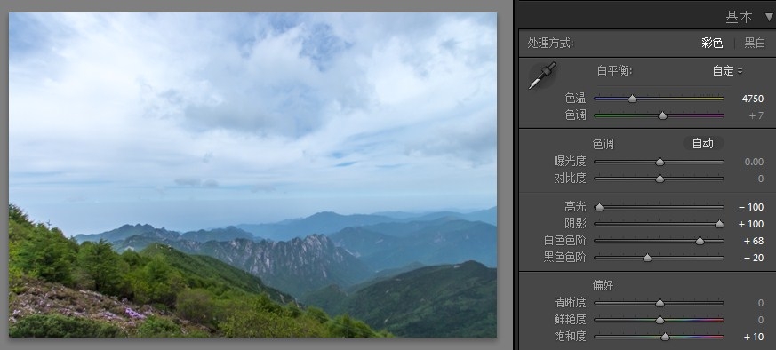 将对比度滑块往右拖动,直方图会向两侧扩展,整个画面中亮的部分更亮,暗的部分更暗。对比度调整适合雾霾或云雾比较多的照片,能使得画面更加清晰。