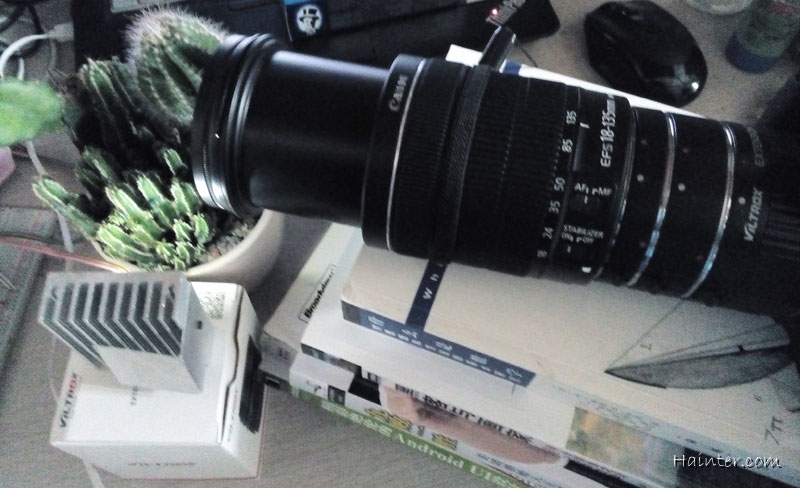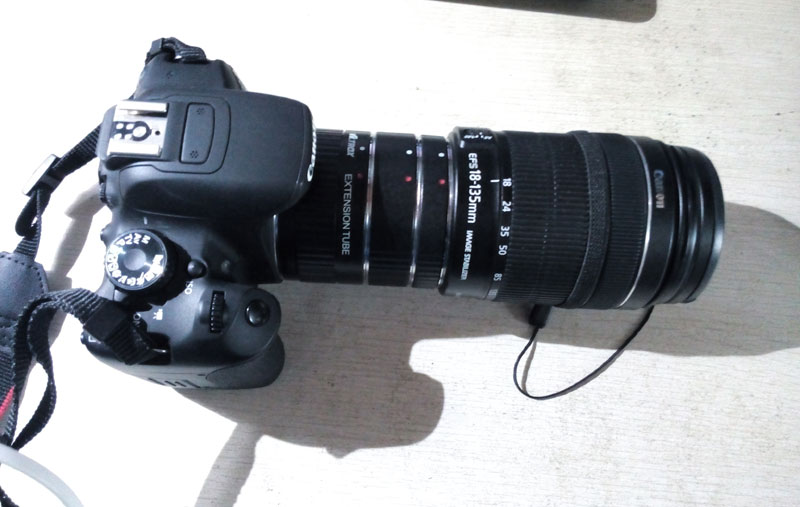 我用的是佳能650D,18-135mm套机,镜头本身就比较长,加上这三个接圈后更是吓人,下面是手机拍的相机图片。