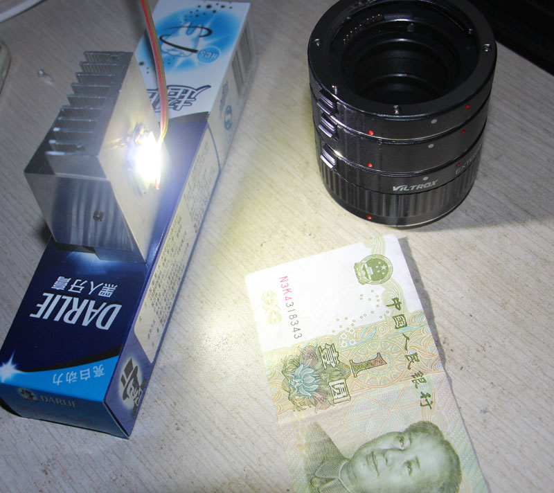 图为我拍摄仙人掌所用的手法,左下角挺大的散热片上装了一个5W的LED,亮度可以随意调节,平时用来做台灯的,必要的时候,可以取下来作为照明,当然完全可以用手电筒之类的东西代替,光线最好是分散柔和型的而不是聚光到一块的那种。右边在相机的下方放了一堆书垫着,刚好很容易调节高度,这样就不用担心晃动造成的影响了。