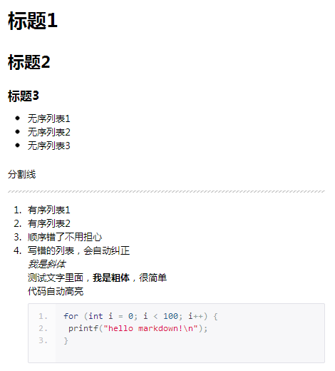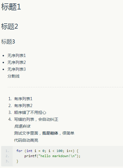 Markdown本身只规定了基本语法,即从Markdown文本转换到HTML文件的规则,并没有规定生成文件的样式(CSS),因此不同的引擎渲染得到的Markdown显示效果不尽相同,另外对于Markdown语法的支持也不完全一致。例如同样是上述代码,经过为知笔记的Markdown渲染之后效果如下: